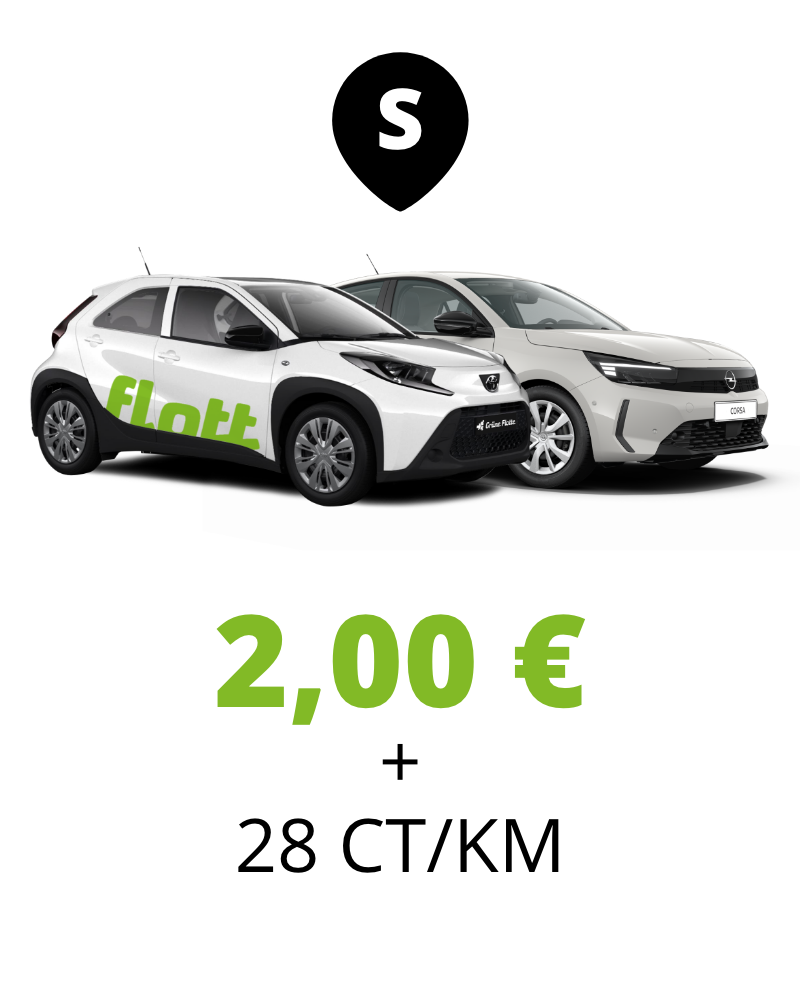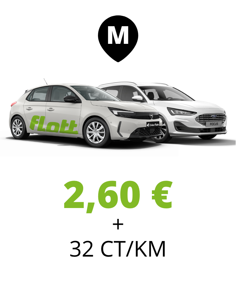 Mit der Grünen Flotte fahren Sie flexibel, günstig und umweltbewusst: ab 1,50 €/h und 0,26 €/km inklusive Kraftstoff. Reservieren Sie sich Ihren Wagen bereits Monate im Voraus oder kurzfristig. Wählen Sie aus Fahrzeugen von XS bis XXL und buchen Sie bequem über die App oder unsere Homepage – kostenlose Stornierung bis 1 Stunde vor Fahrtbeginn. Mit unserer Grünen Karte zahlen Sie nur, wenn Sie fahren.